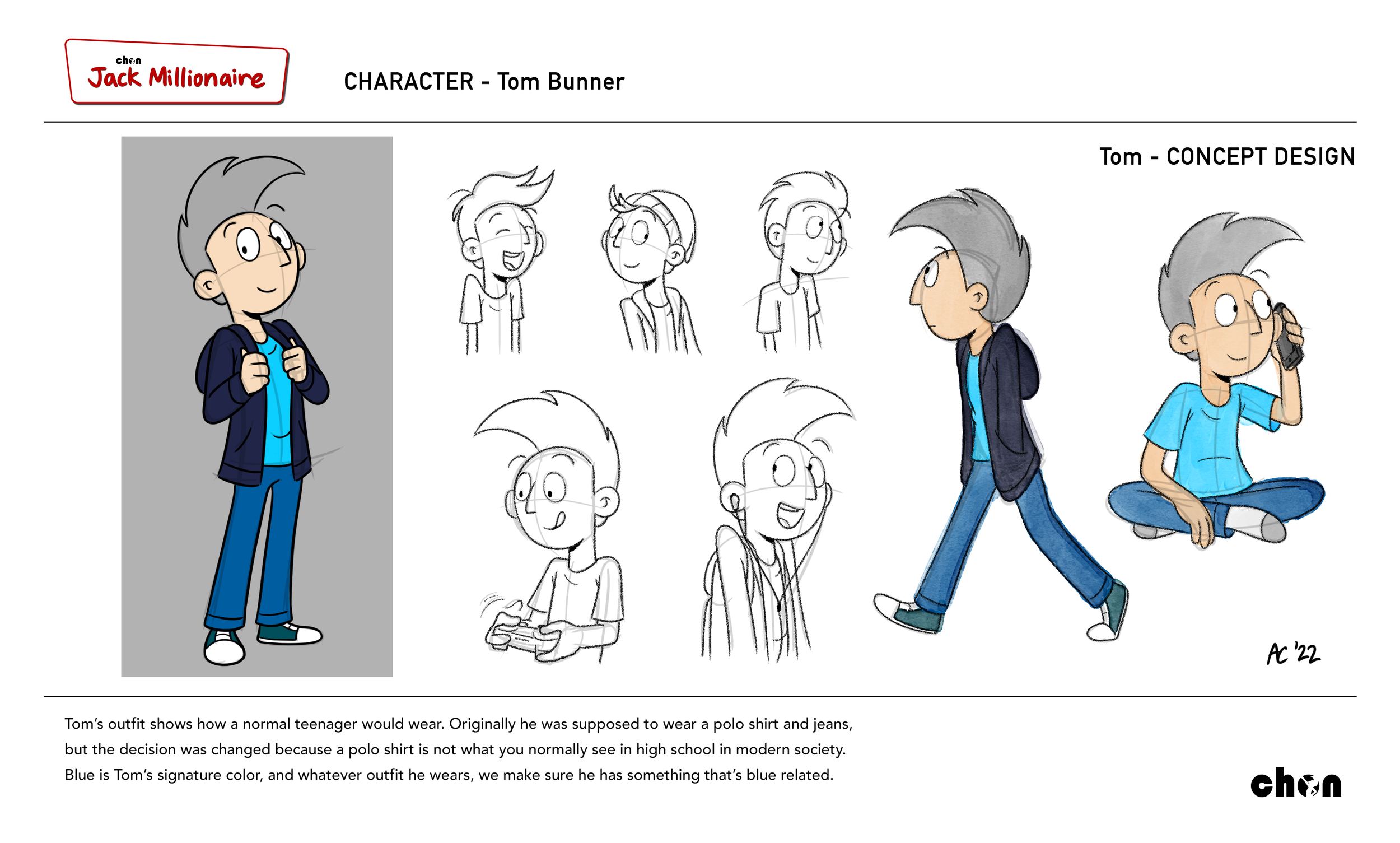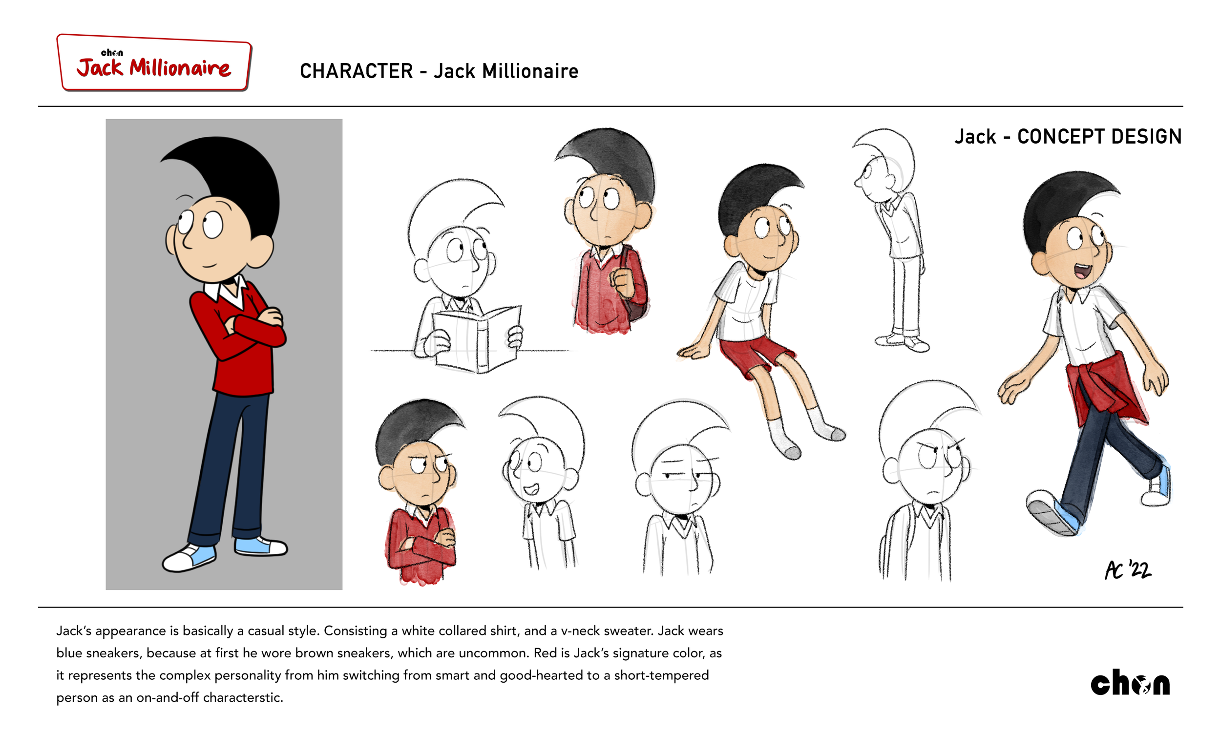 Jack Millionaire introduces a multitude of fun and quirky characters that make the world feel alive, including our young hero, Jacob Yong Millionaire (aka. Jack). The whole point of Jack as a character was basically to show how the viewers can relate to him. I feel creating him as a teen would make him more believable to audiences. The struggles and weaknesses he has are some of those that young teens would face time and time again and find a way to fix or overcome it.