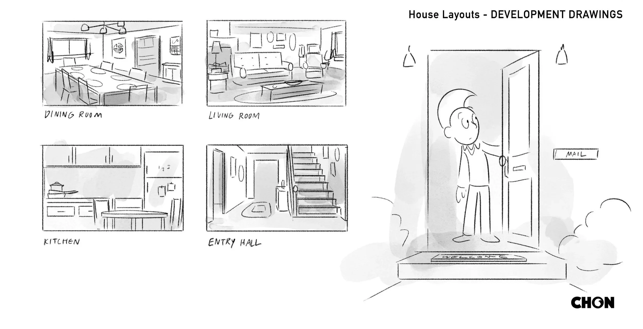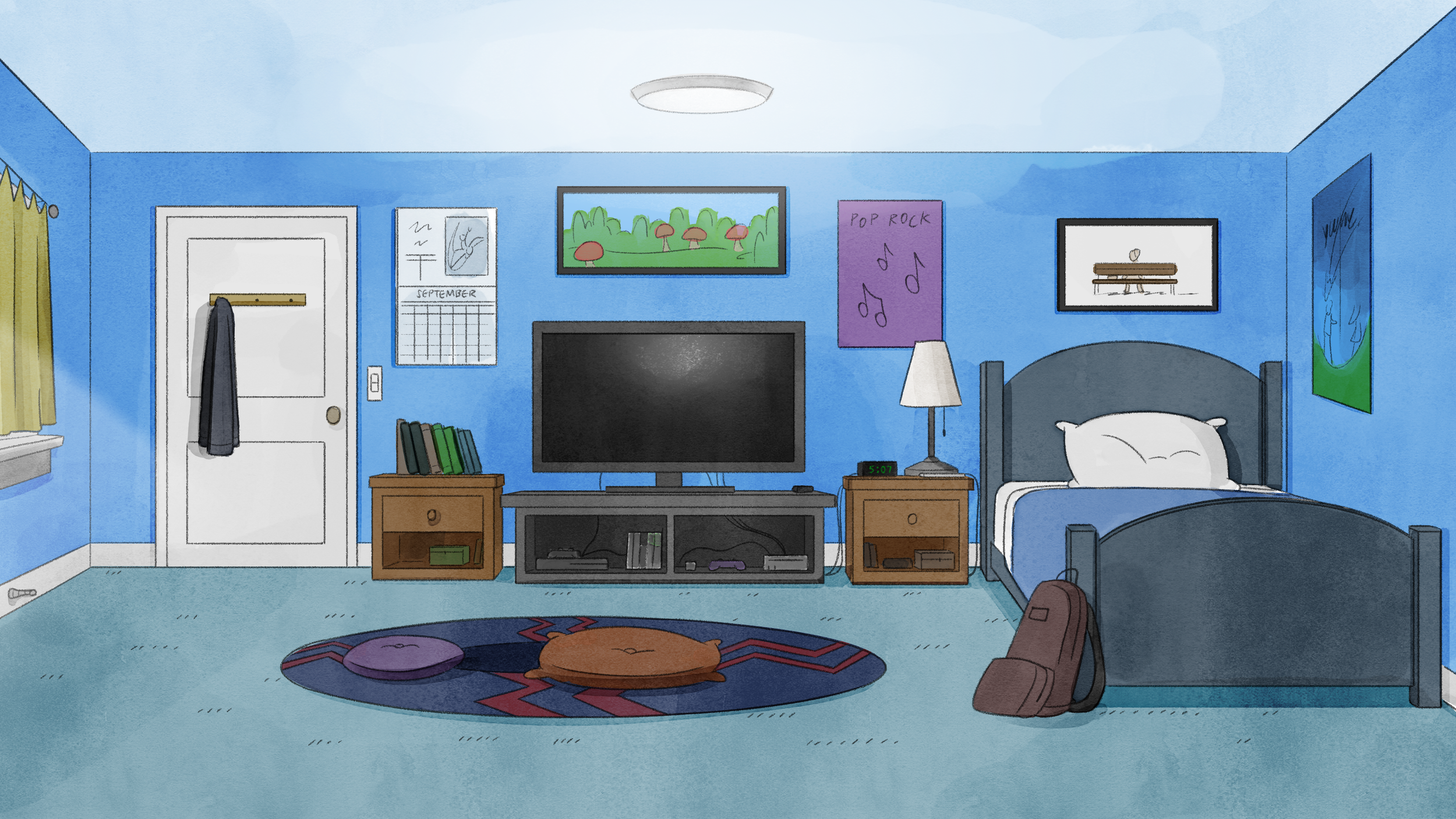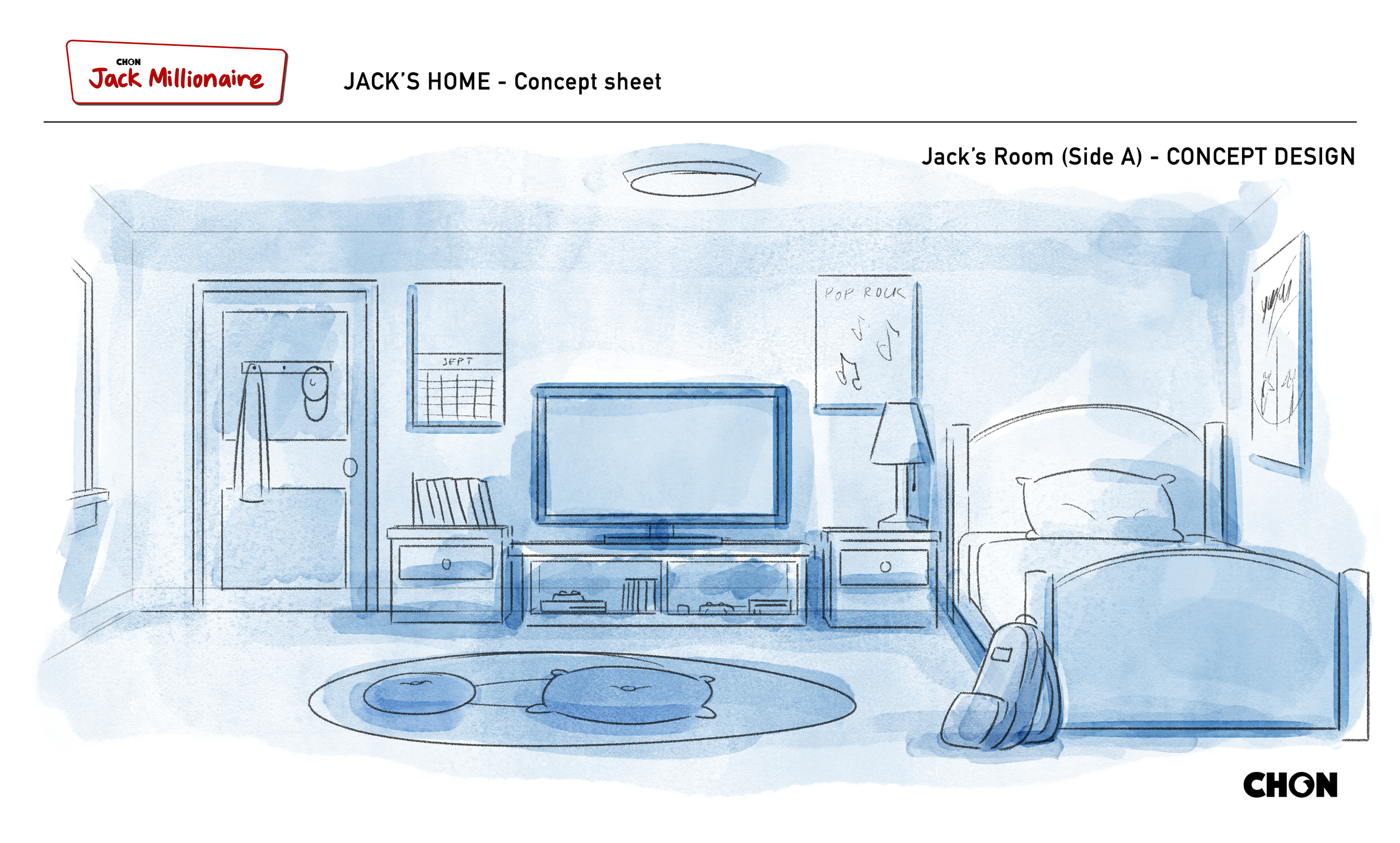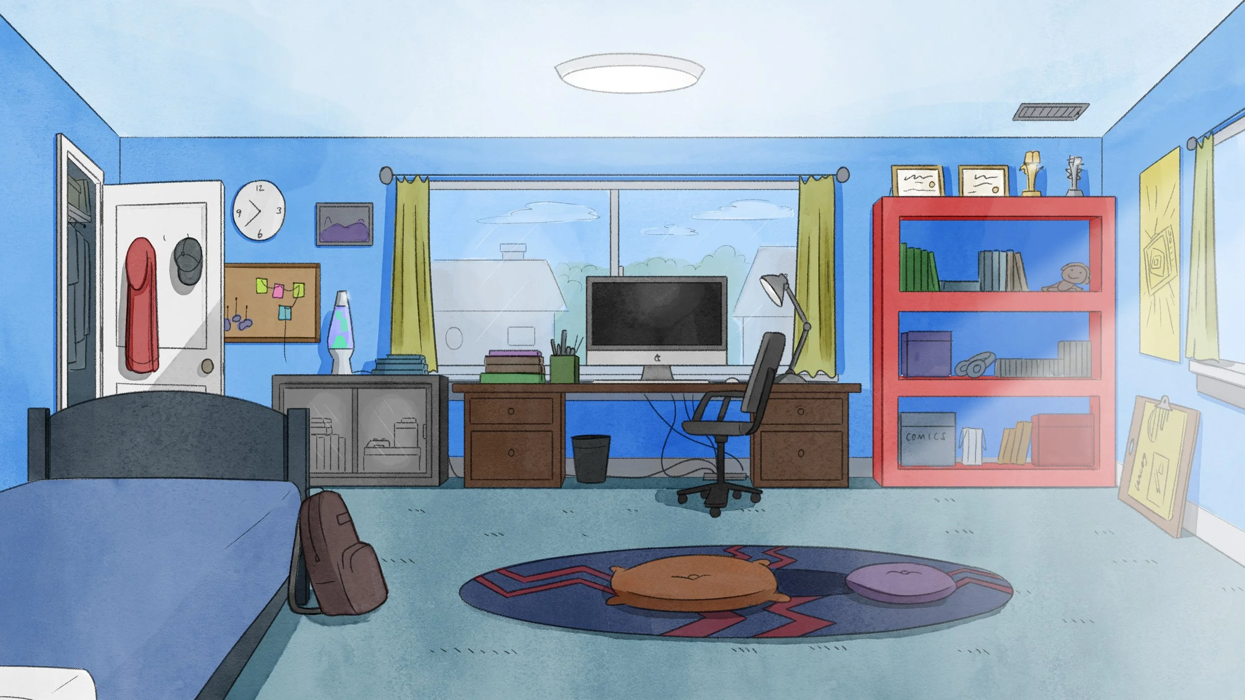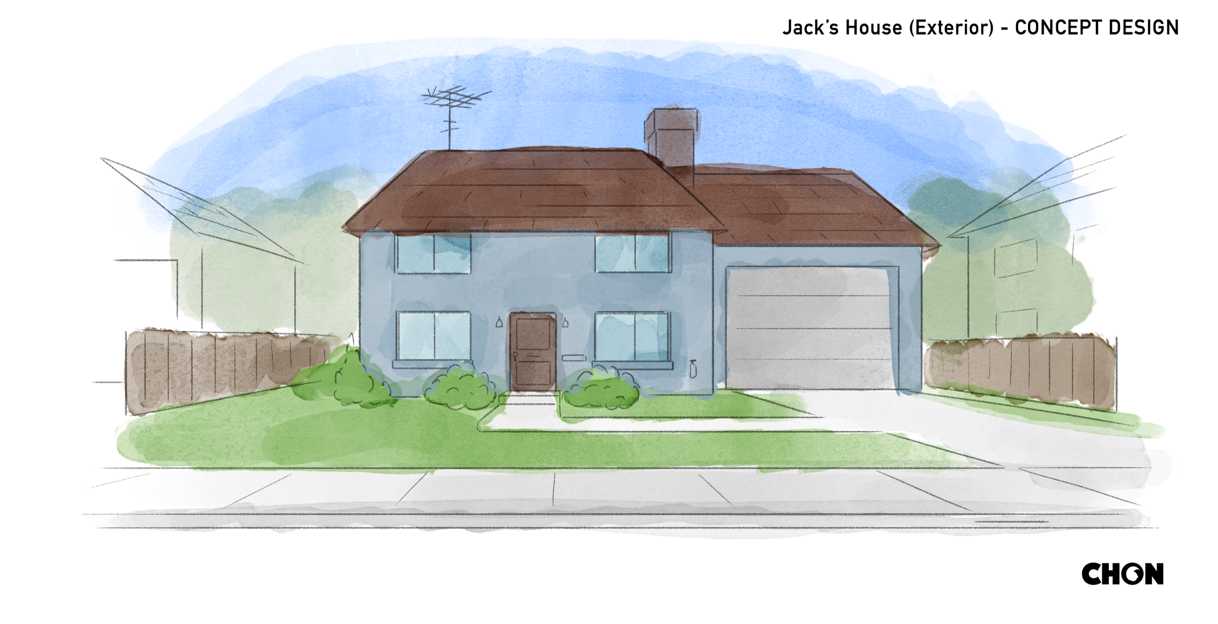 The architecture for the series was to build a sense of minor realism in a cartoonish fictional world. We build houses that have a vibe inspired by the 21st century. Jack's house in particular was one of the first sets to develop as the majority of the series usually takes place where our favorite teen boy lives because he is the main character. Households include a modern computer inspired by an iMac, smart TVs, etc.